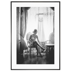 このモノクロアートフォトは、クラシックな椅子に腰掛ける女性が結婚式前の静かなひとときを過ごす姿をとらえています。背後にはレースのカーテンを通して光が差し込み、中央にはウェディングドレスが吊るされており、これから始まる特別な一日への高揚感と緊張が美しく表現されています。女性の柔らかな表情とポージング、室内の装飾が織りなす優雅な空気感が、物語性を持つ一枚となっています。