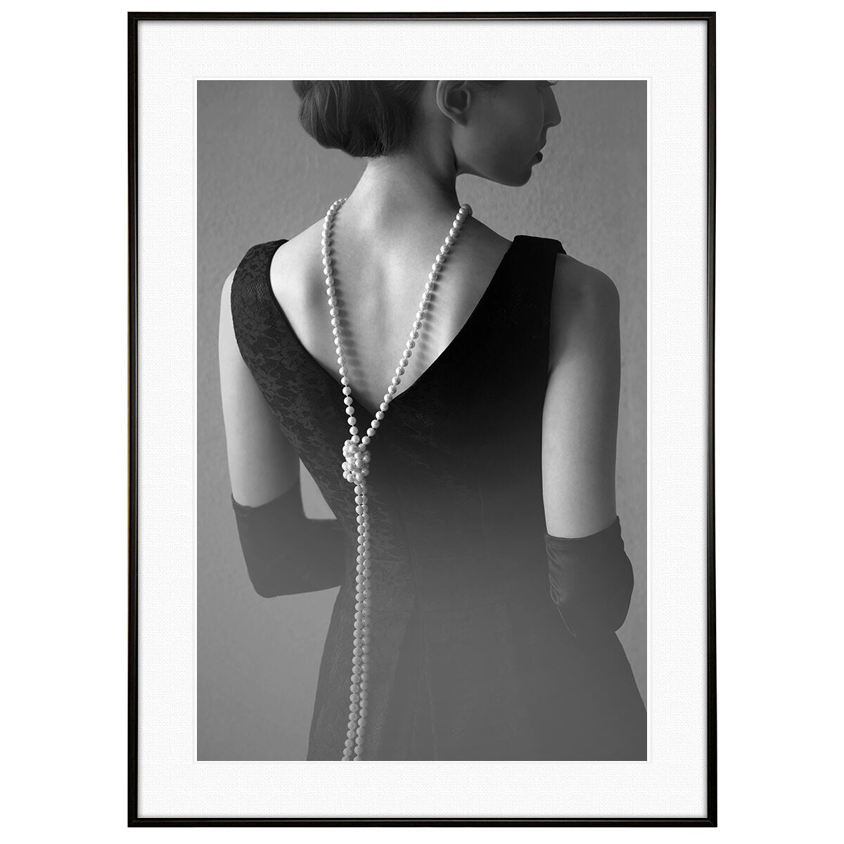 クラシックな黒いドレスとロンググローブを身にまとい、背中に流れるようにかけられた一連のパールネックレスを際立たせた女性の後ろ姿をとらえ、優雅さと静謐な美を表現しています。