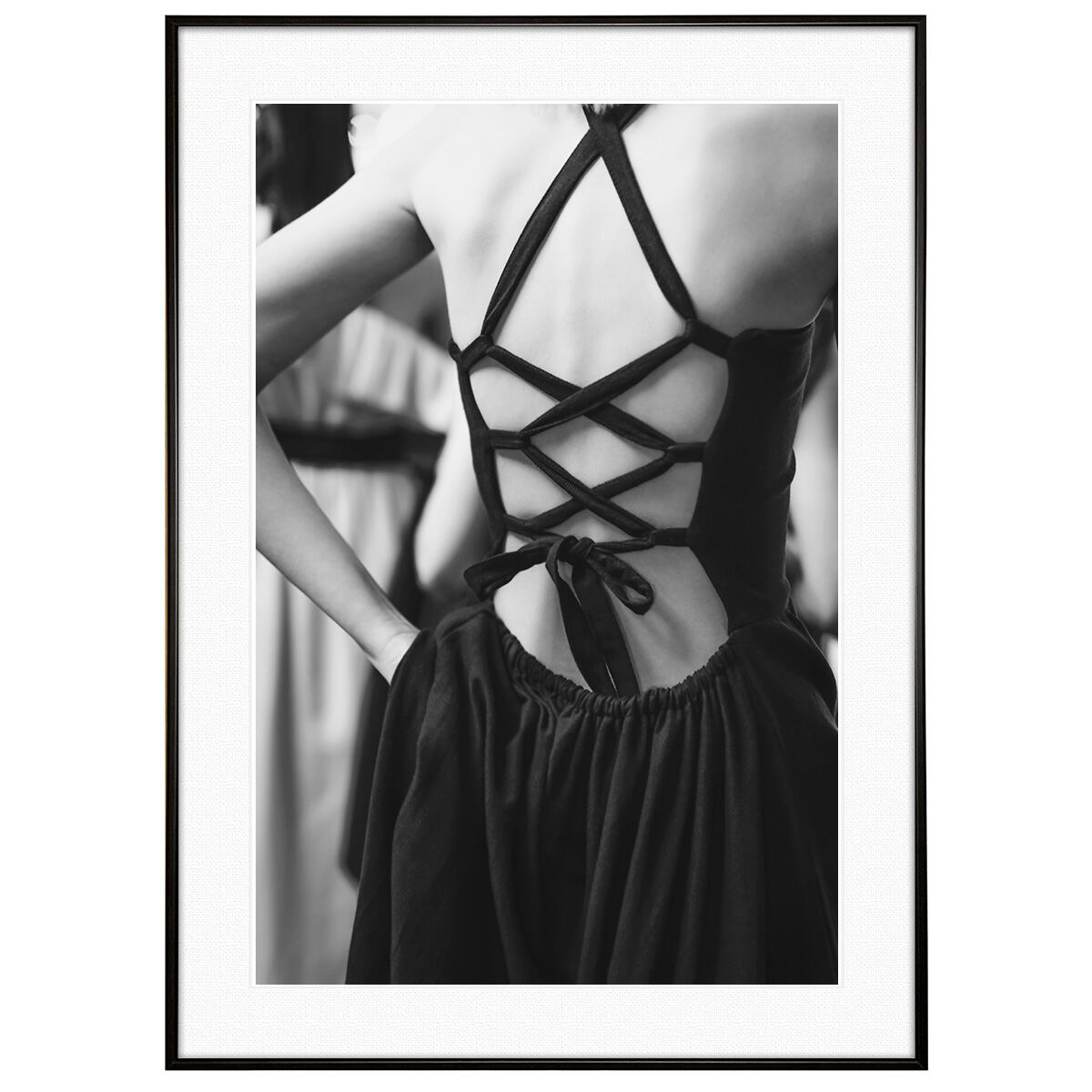 背中を大胆に見せた編み上げデザインのドレスを身にまとった女性の後ろ姿をとらえ、しなやかな身体と緊張感のある構図が、静かなる意志と美を感じさせる一枚です。洗練されたファッション性とモノクロの陰影による造形美が際立つ本作品は、モダンな空間やアート感のあるインテリアに調和し、空間全体をスタイリッシュに引き締めるアクセントとしておすすめです。