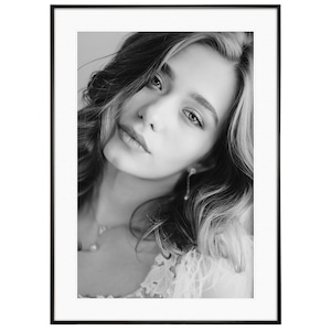 柔らかな光を浴びた女性がわずかに首を傾け、透明感のある瞳で静かに見つめる姿を捉えており、繊細な髪の流れや肌の質感が美しく際立っています。優しい表情と淡い光のコントラストが空間に穏やかで上品な雰囲気をもたらし、リビングや寝室に飾ることで、日常に癒しと洗練された美しさを添えることができます。