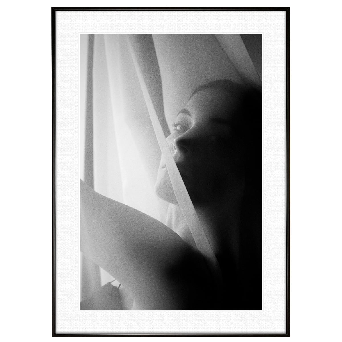 このモノクロ写真は、薄いカーテン越しに女性の横顔をとらえた作品です。柔らかな布の透け感と陰影が、人物の表情に神秘性と詩的な余韻を与えています。光を受けて浮かび上がる眼差しが、静けさの中に強い存在感を示す印象的なアートフォトです。この写真を飾ることで、空間に神秘的で優美な雰囲気を添え、穏やかで洗練されたムードを演出できるかもしれません。