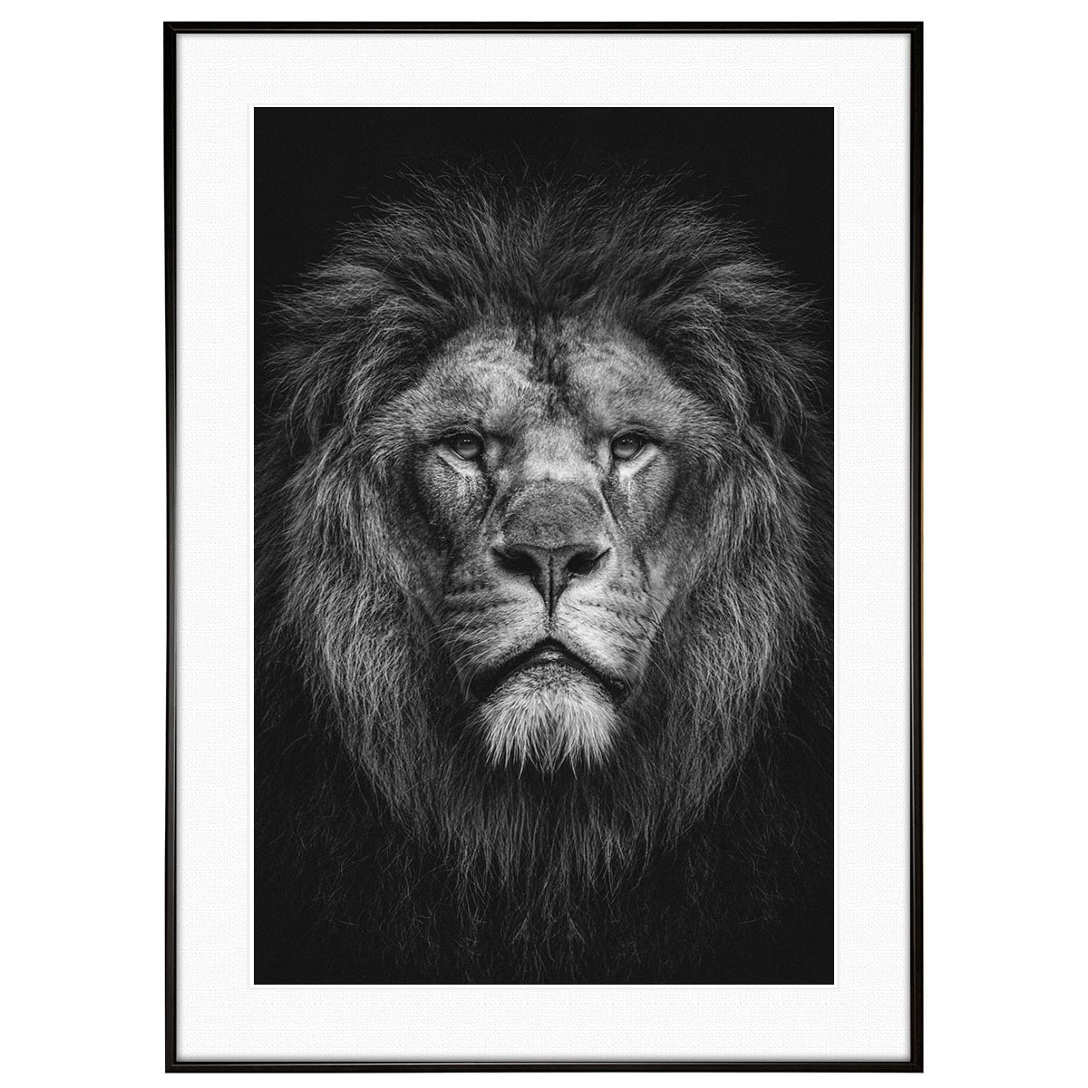 正面を真っ直ぐに見据える雄ライオンの眼差しを、精緻なモノクロームで捉えた威厳溢れるアートワークです。白と黒の強いコントラストが、たてがみの一本一本や生命力に満ちた質感を際立たせ、静寂の中に圧倒的な存在感を放っています。