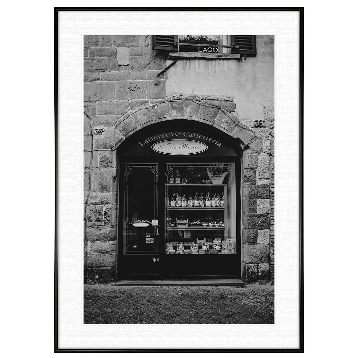 店舗の看板に記された「Latteria & Caffetteria di Zia Manu」は、中世の面影を色濃く残すベルガモの歴史的な通りに実在する、地元で愛されるカフェ・乳製品店です。