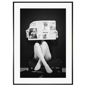 モノクロームのコントラストが美しい、洗練されたファッション・アートです。椅子に座り、顔を隠すようにファッション誌を広げた女性の姿が切り取られており、白のタイツが描く幾何学的なラインが都会的でスタイリッシュな印象を与えます。