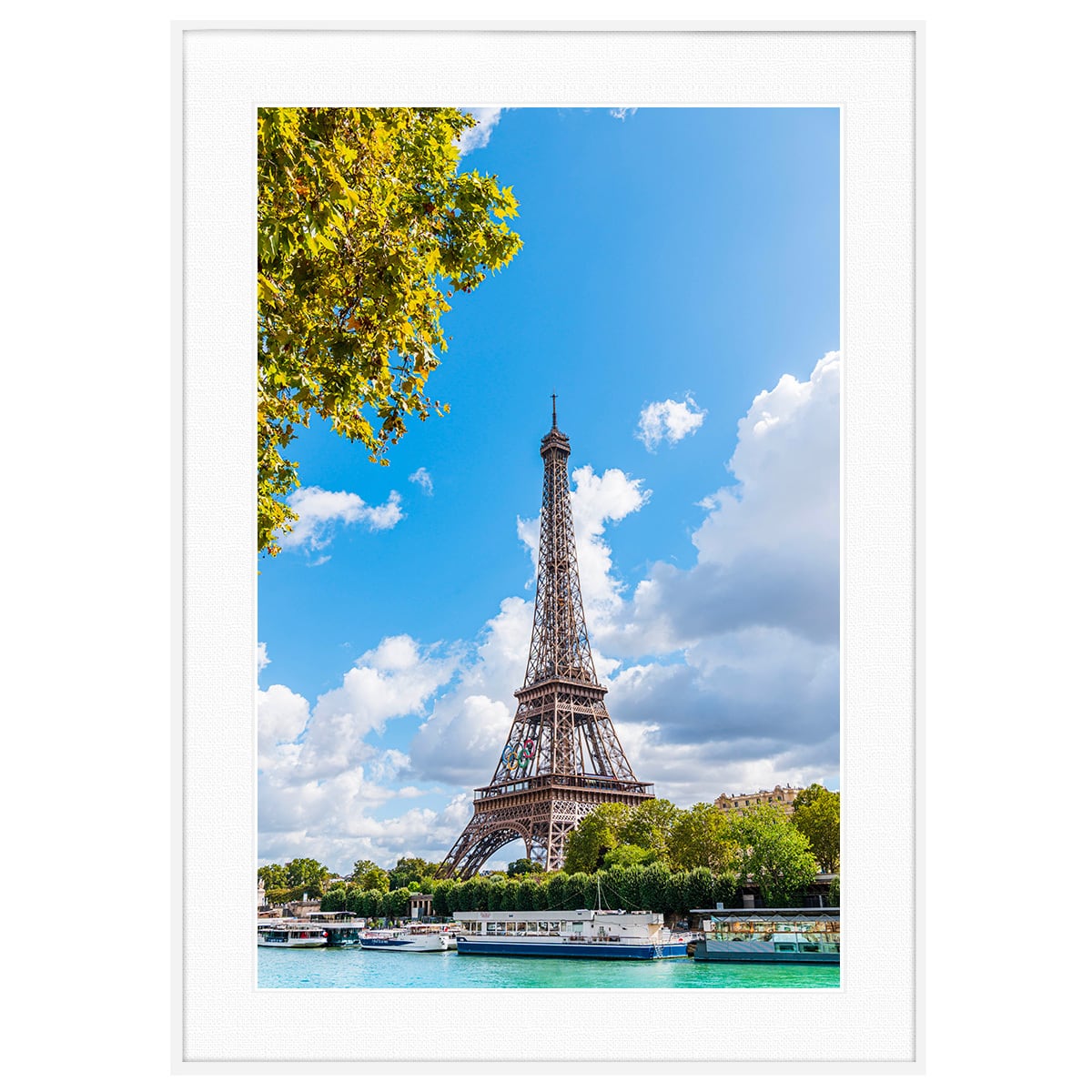 青い空にそびえ立つエッフェル塔とセーヌ川の風景を切り取った、清々しさと躍動感に溢れる一枚です。塔のなかほどには五輪のマークが輝き、2024年のパリ・オリンピックという歴史的な記憶を色鮮やかに現代へと伝えています。