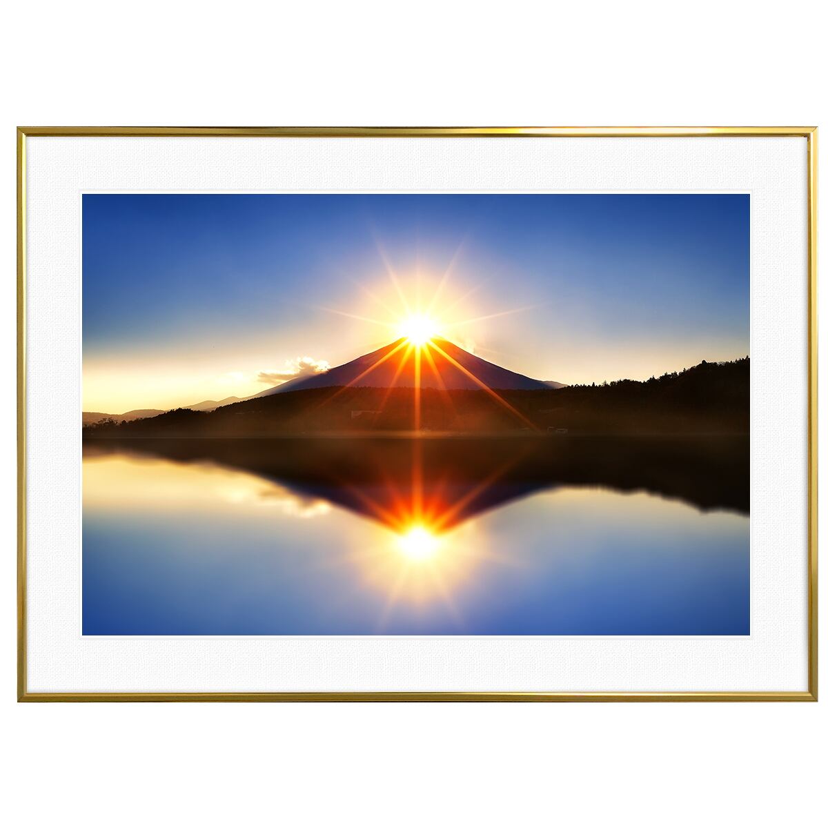 静寂に包まれた湖面に、山体と光の輝きが完璧な左右対称(シンメトリー)で映し出される「逆さ富士」も相まって、自然の調和と神秘性を強く感じさせます。金色の額装がこの輝かしい瞬間をさらに引き立て、空間に気品を与えています。
