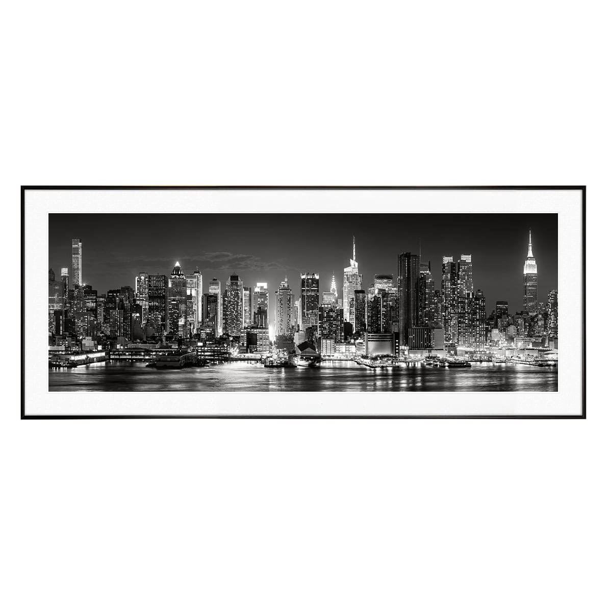 ニューヨーク・マンハッタンの壮麗な夜景を捉えたこのパノラマ写真は、エンパイア・ステート・ビルをはじめとする象徴的な高層ビル群が光の粒となり、水面に美しく反射する様子をモノトーンで表現しています。