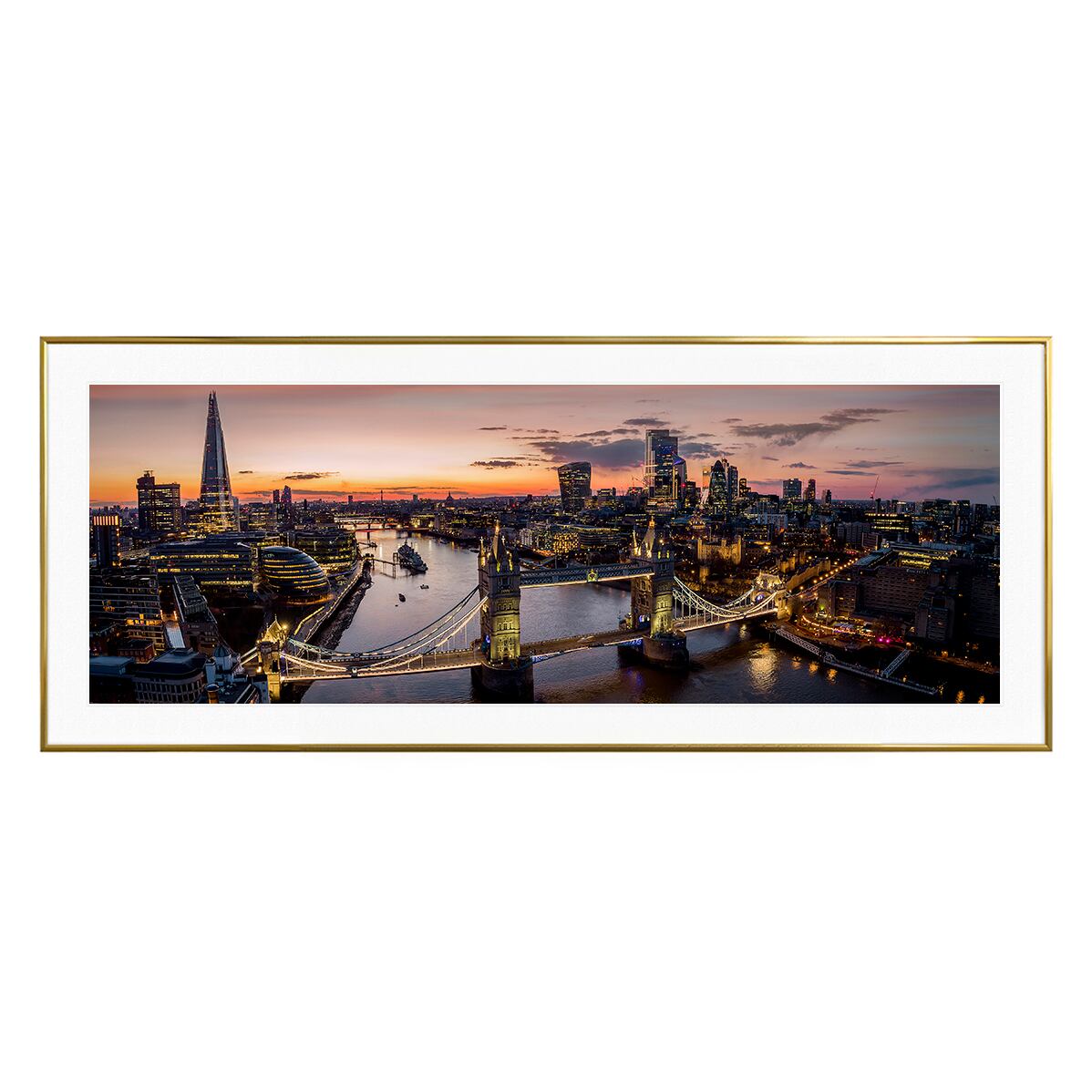 夕暮れ時のロンドンをパノラマで捉えたこの写真は、ライトアップされたタワーブリッジを中心に、左手には象徴的なザ・シャード、奥には近代的なビル群が並ぶ、伝統と革新が融合した美しい都市景観を描いています。