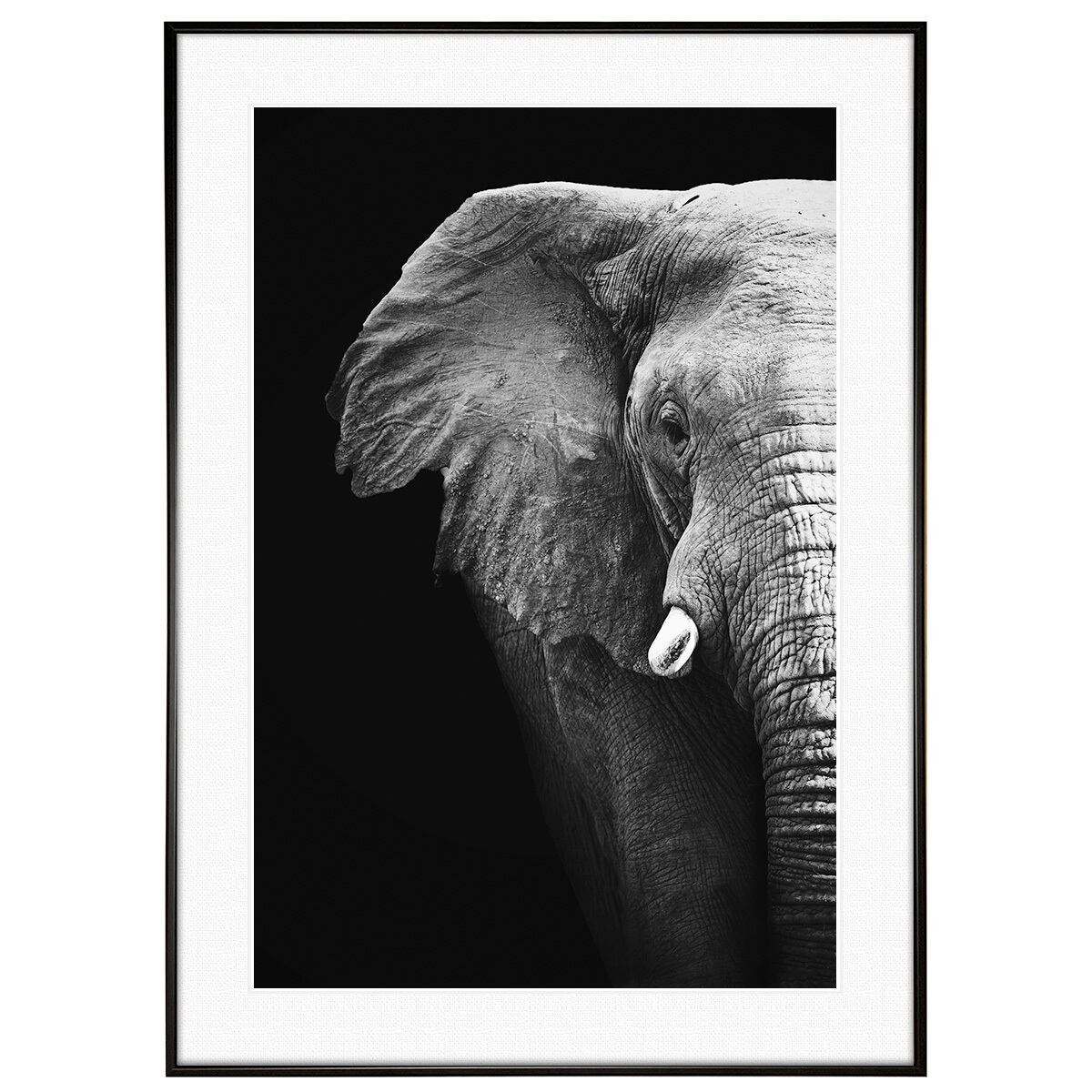 この作品を部屋に飾る最大のメリットは、空間に圧倒的な「重厚感」と「落ち着き」をもたらすことです。モノクロの配色はどんなインテリアにも馴染みやすく、視覚的なノイズを抑えて心を穏やかに整えてくれます。また、象は知性や幸福の象徴とされることも多いため、リビングや書斎に飾ることで、洗練された品格とともに、見る人に安心感とインスピレーションを与える特別な空間を演出できるでしょう。