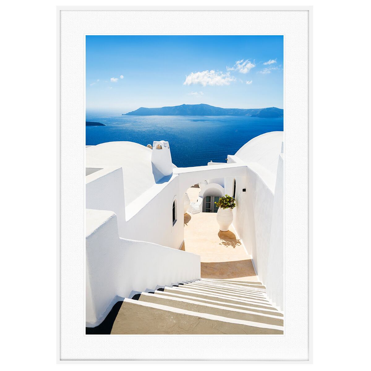 サントリーニ島の象徴的な風景を描いたこの写真は、鮮やかな「エーゲ海ブルー」と潔い「白壁の建築」のコントラストが美しく、見る人を一瞬で地中海の開放感へと誘います。