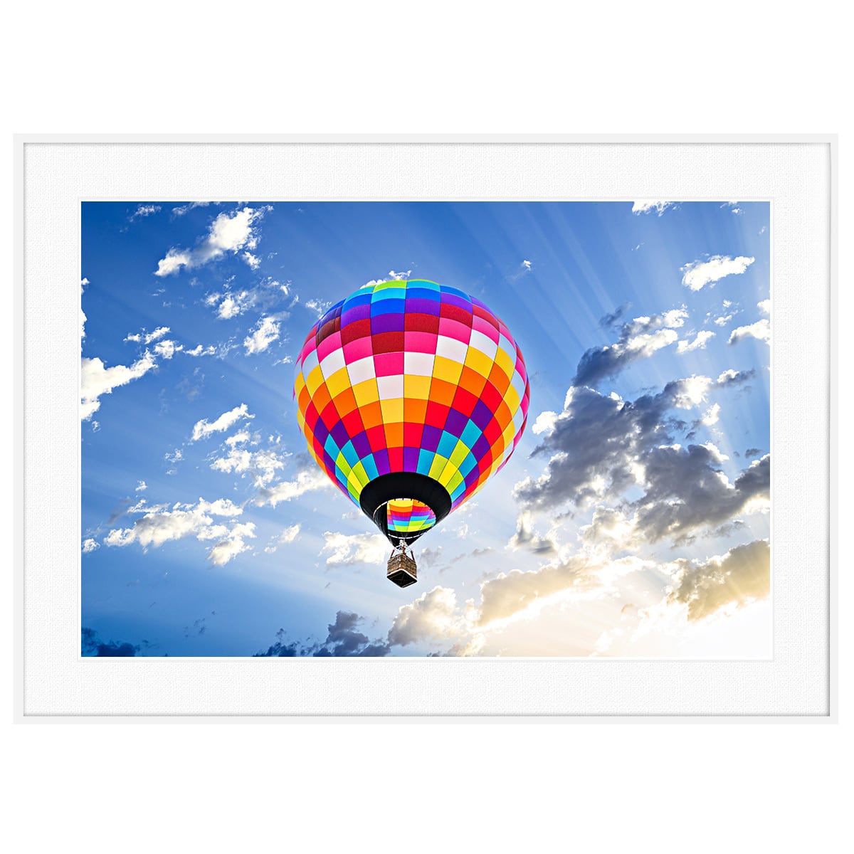 空に映えるカラフルな熱気球を捉えたこの写真は、雲の間から降り注ぐ光の梯子が幻想的な開放感を演出しています。鮮やかな色彩が並ぶ気球のデザインは視覚的なアクセントとなり、空間にポジティブなエネルギーと遊び心をもたらしてくれます。